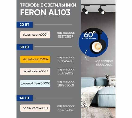 Ниже Вы можете прочитать отзывы на Светодиодный светильник Feron AL103 трековый однофазный на шинопровод 30W 6400K, 35 градусов, черный, ознакомится с подробными характеристиками, посмотреть интересные обзоры и фотографии на Светодиодный светильник Feron AL103 трековый однофазный на шинопровод 30W 6400K, 35 градусов, черный.