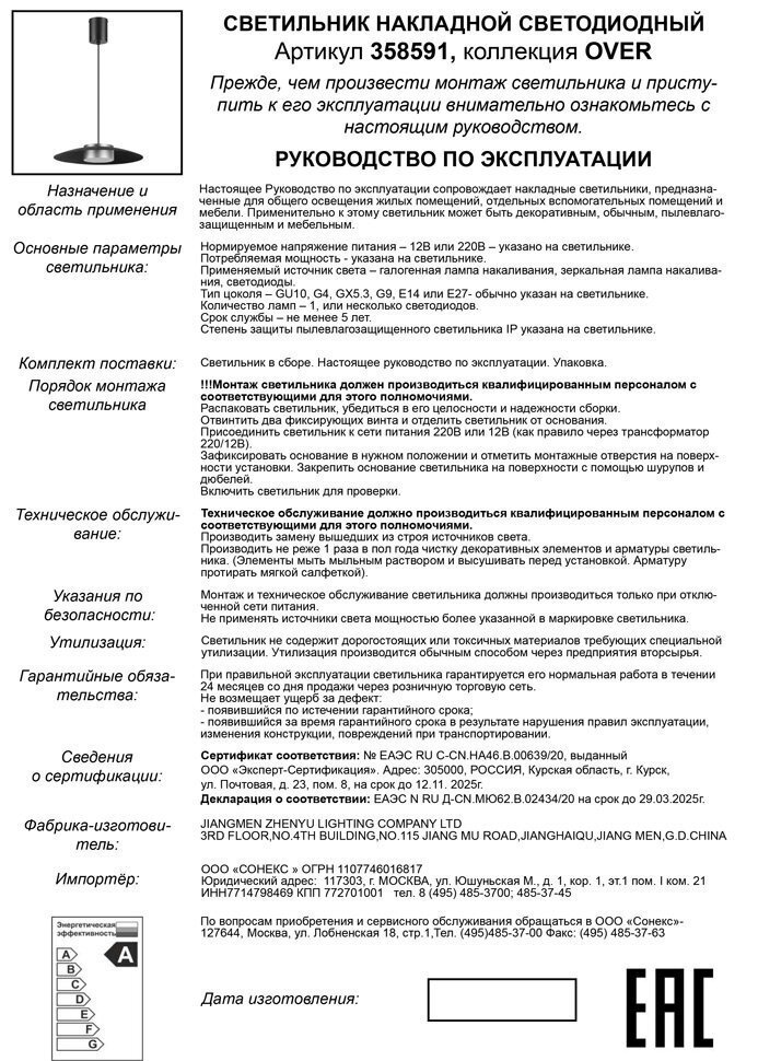 358591 OVER NT21 191 черный/золото Светильник накладной светодиодный, провод 2м IP20 LED 4000K 18W 220-240V PILZ