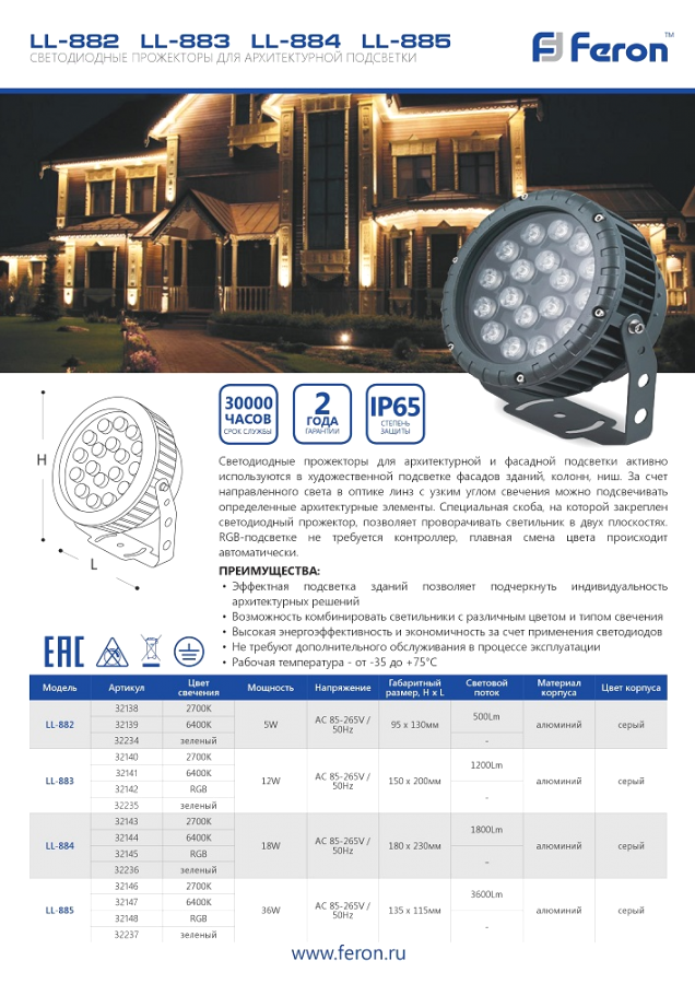 Feron LL-883 Прожектор ландшафтно-архитектурный светодиодный, на кронштейн (до) , 12W, 32235