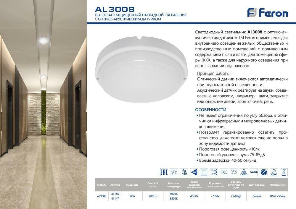 Светильник светодиодный ДБП-12w с оптико-акустическим датчиком 4000К 900Лм IP65 круглый белый | код. 41146 | FERON ( 1шт. )