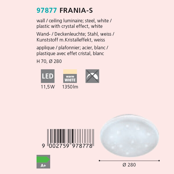 Cветод. настенно-потолочный светильник FRANIA-S, 11,5W (LED), 1350lm, Ø280, H70, cталь, белый/пластик с эф-м хрусталя, белый