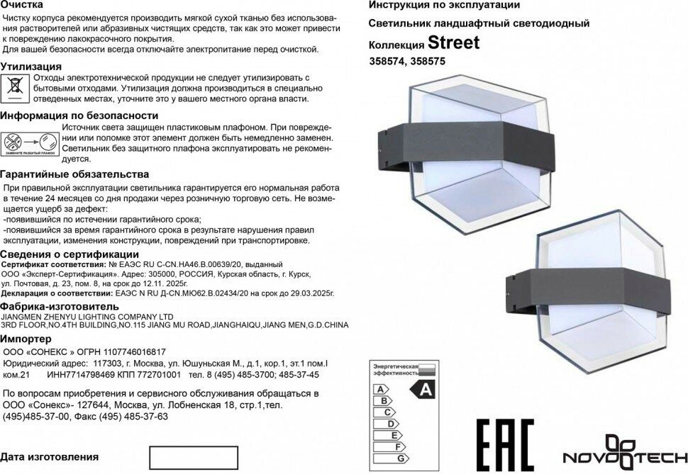 | Подробная комплектация | Уличное освещение Novotech 358574 |
