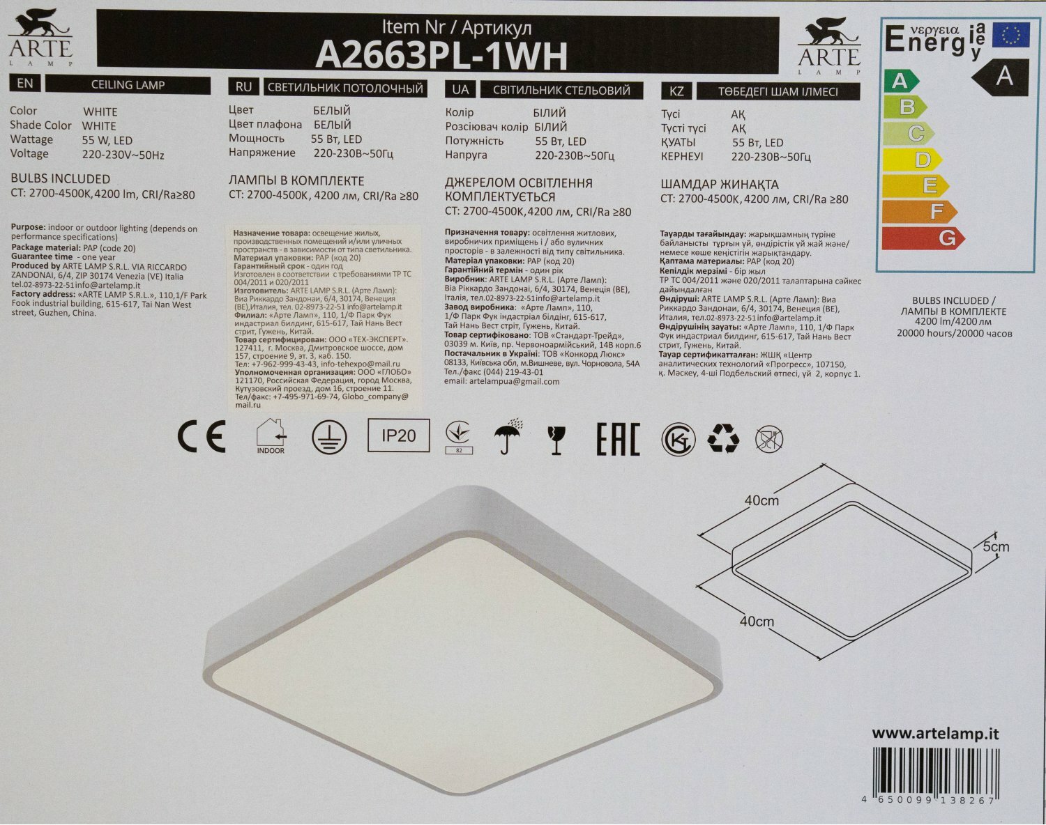 Светильник диодный 400*400мм 55Вт Arte lamp A2663PL-1WH SCENA