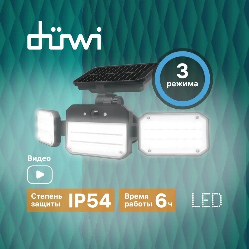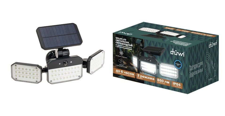 Светодиодный светильник с датчиком движения и освещения duwi Solar LED на солнечных батареях, 14Вт, 6500К, 850Лм, IP65, 3 режима, цвет черный 25028 9