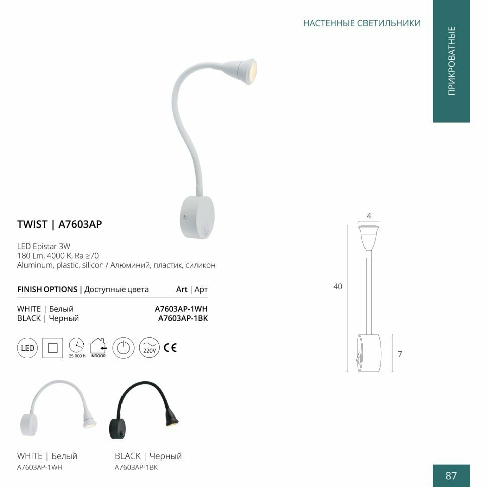 Бра светодиодный Arte Lamp TWIST A7603AP-1WH, LED 3 Вт белый