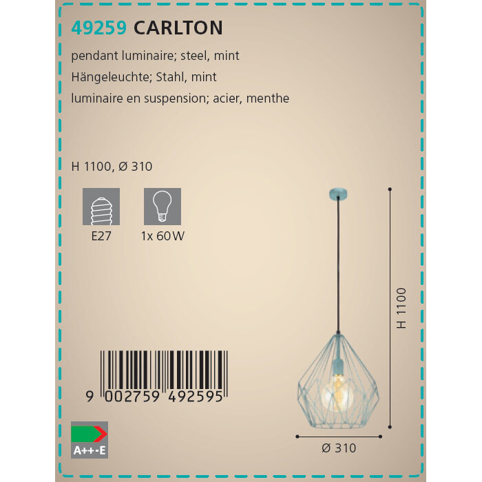 Купить 49259 Подвес CARLTON 1, 1x60W (E27), Ø310, H1100, сталь, мята