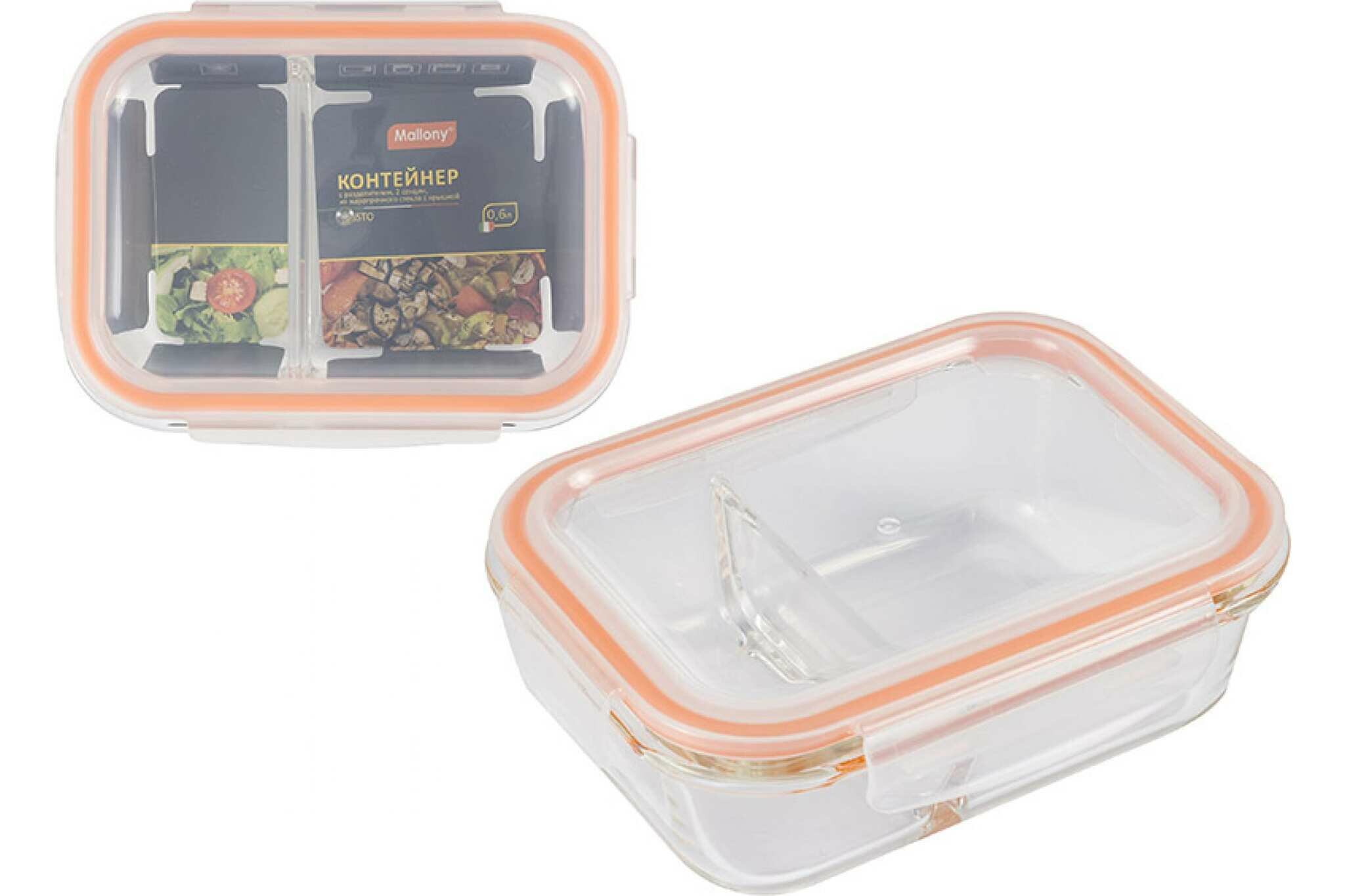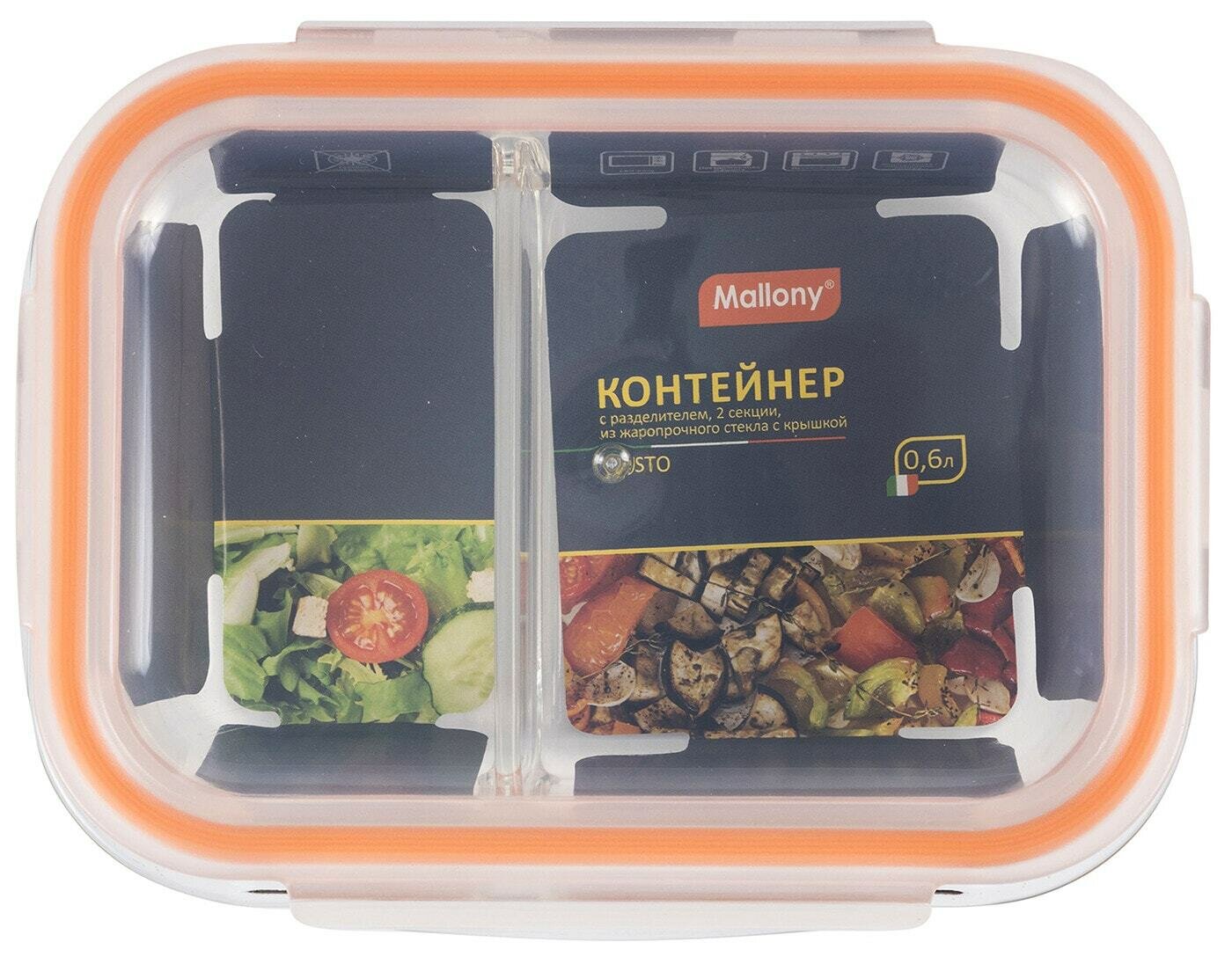Контейнер Mallony Gusto, 600 мл, 2 секции из жаропрочного стекла с крышкой с защёлками 008676 .