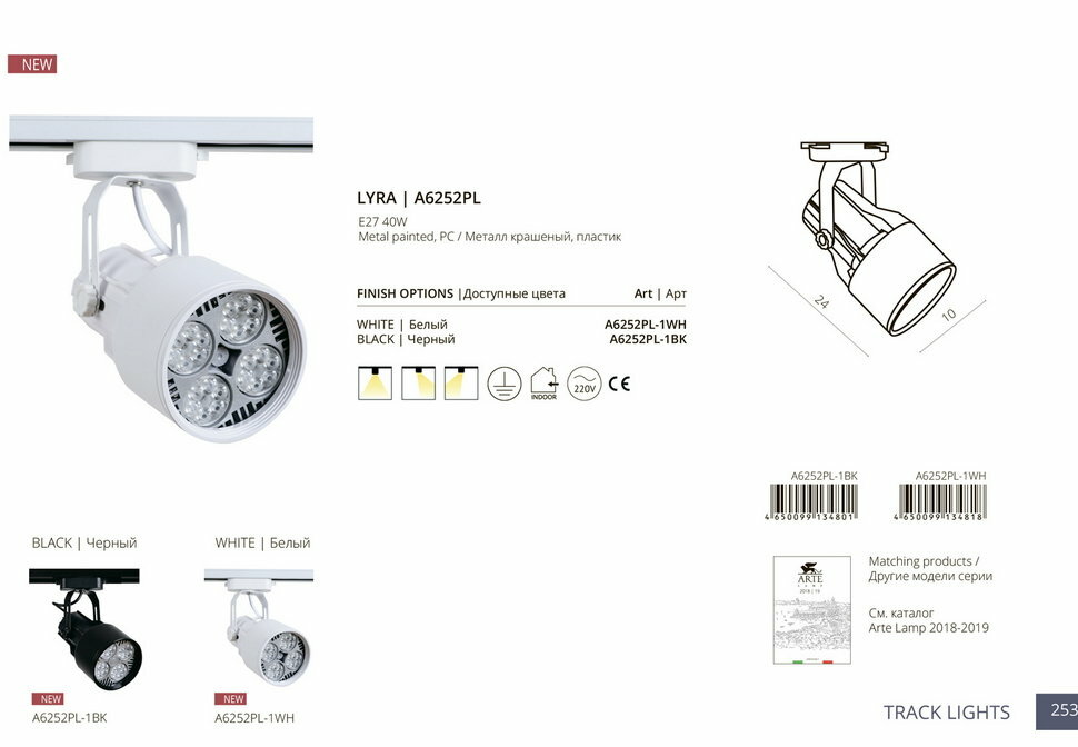 Светильник трековый ARTE LAMP LYRA (A6252PL-1WH) E27 40 Вт 220 В белый IP20