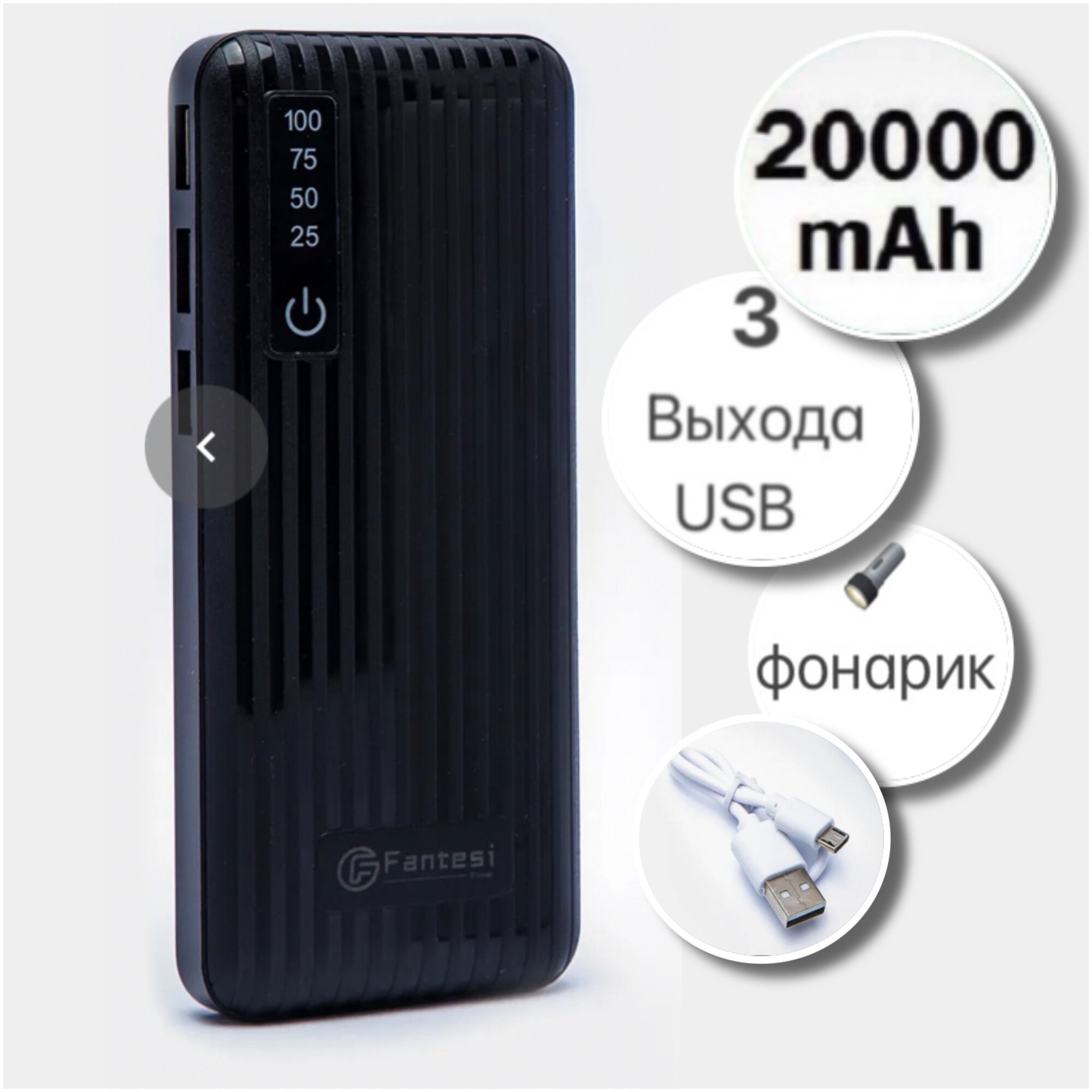 | Дополнительная информация | Можно заряжать одновременно 3 устройства, встроенный фонарик |