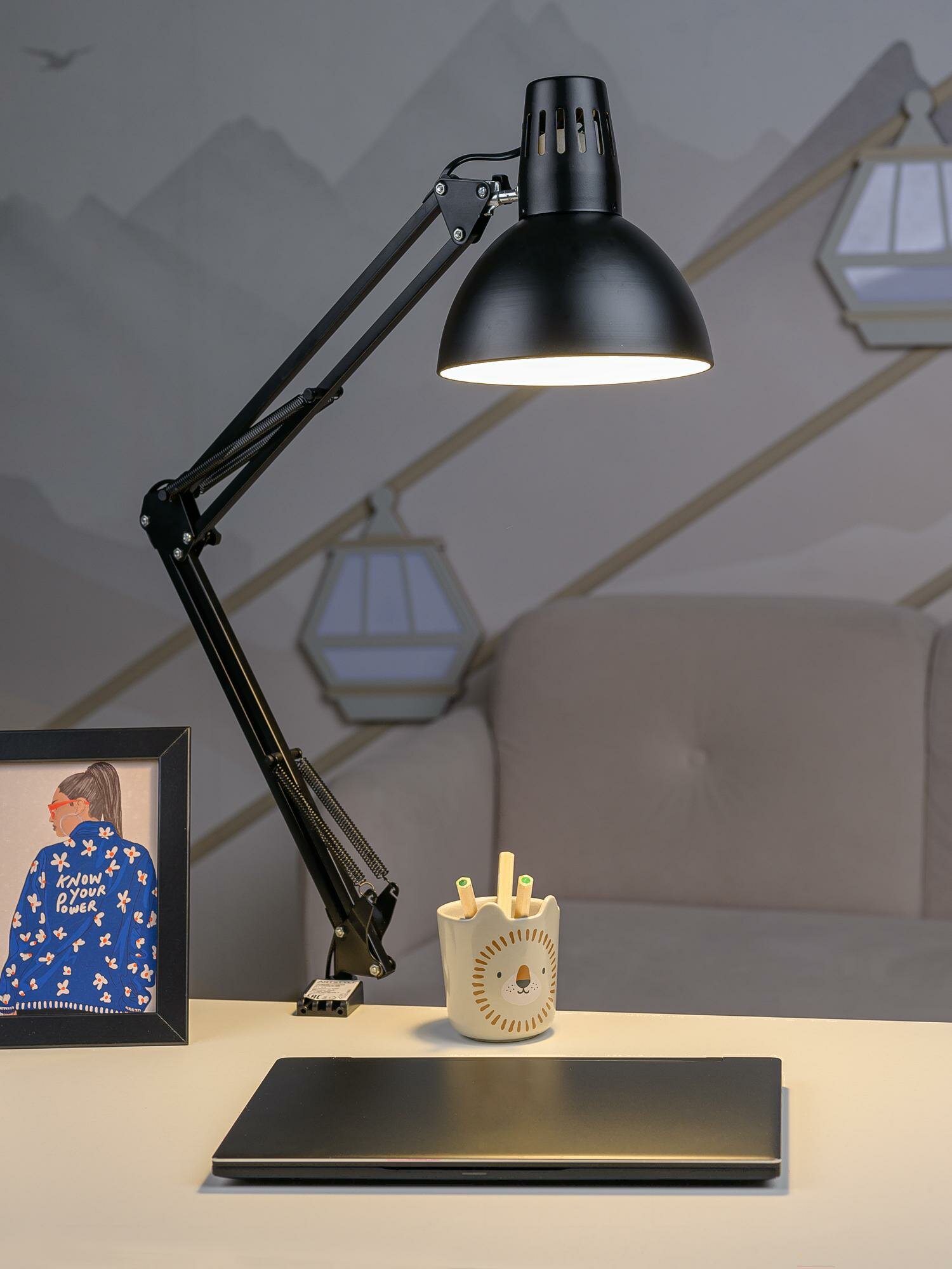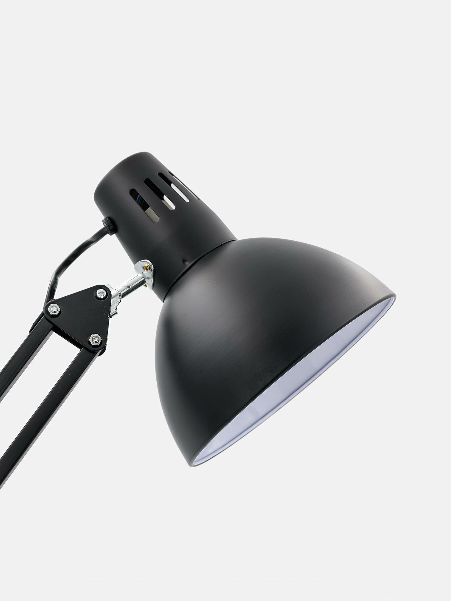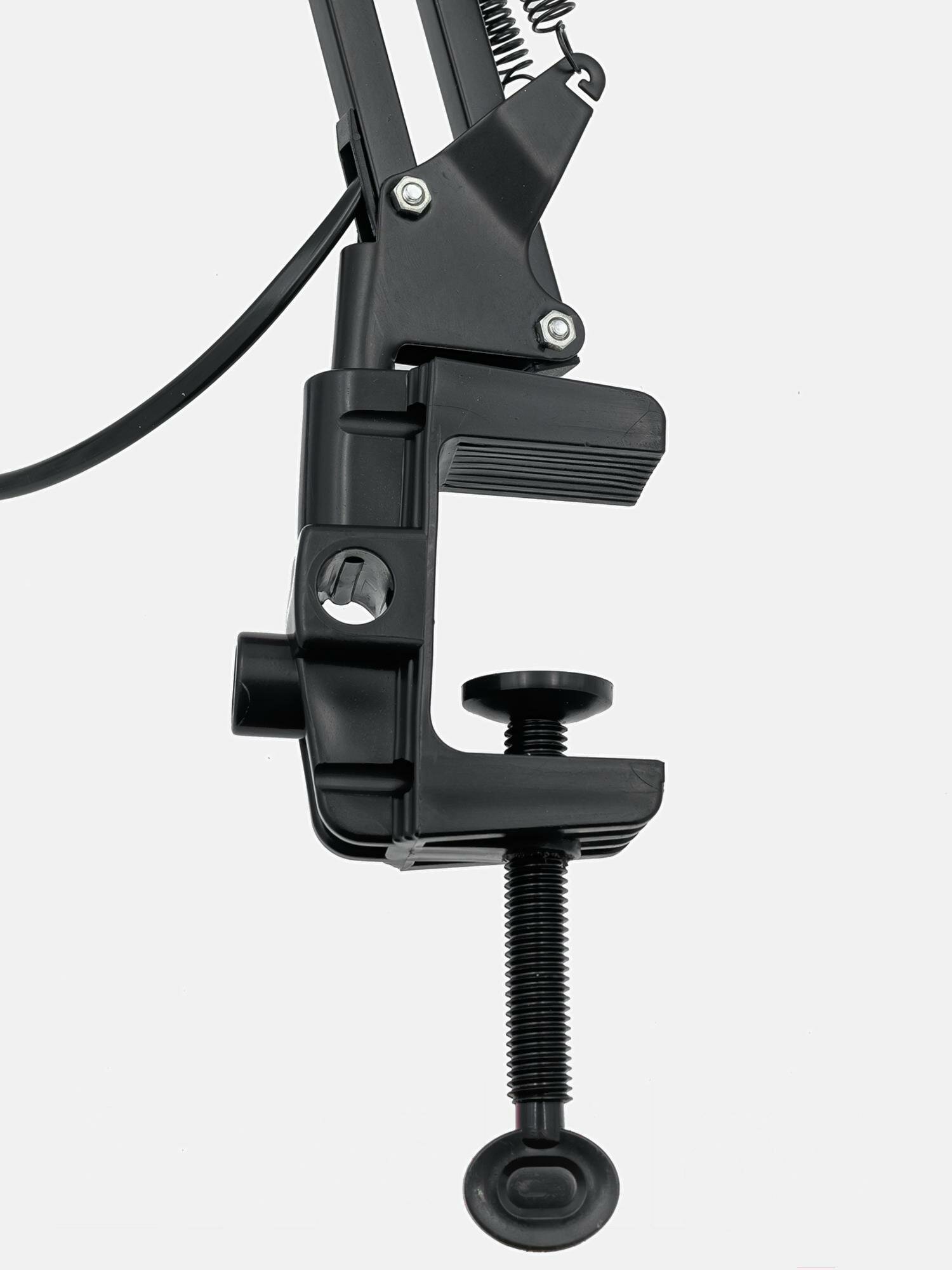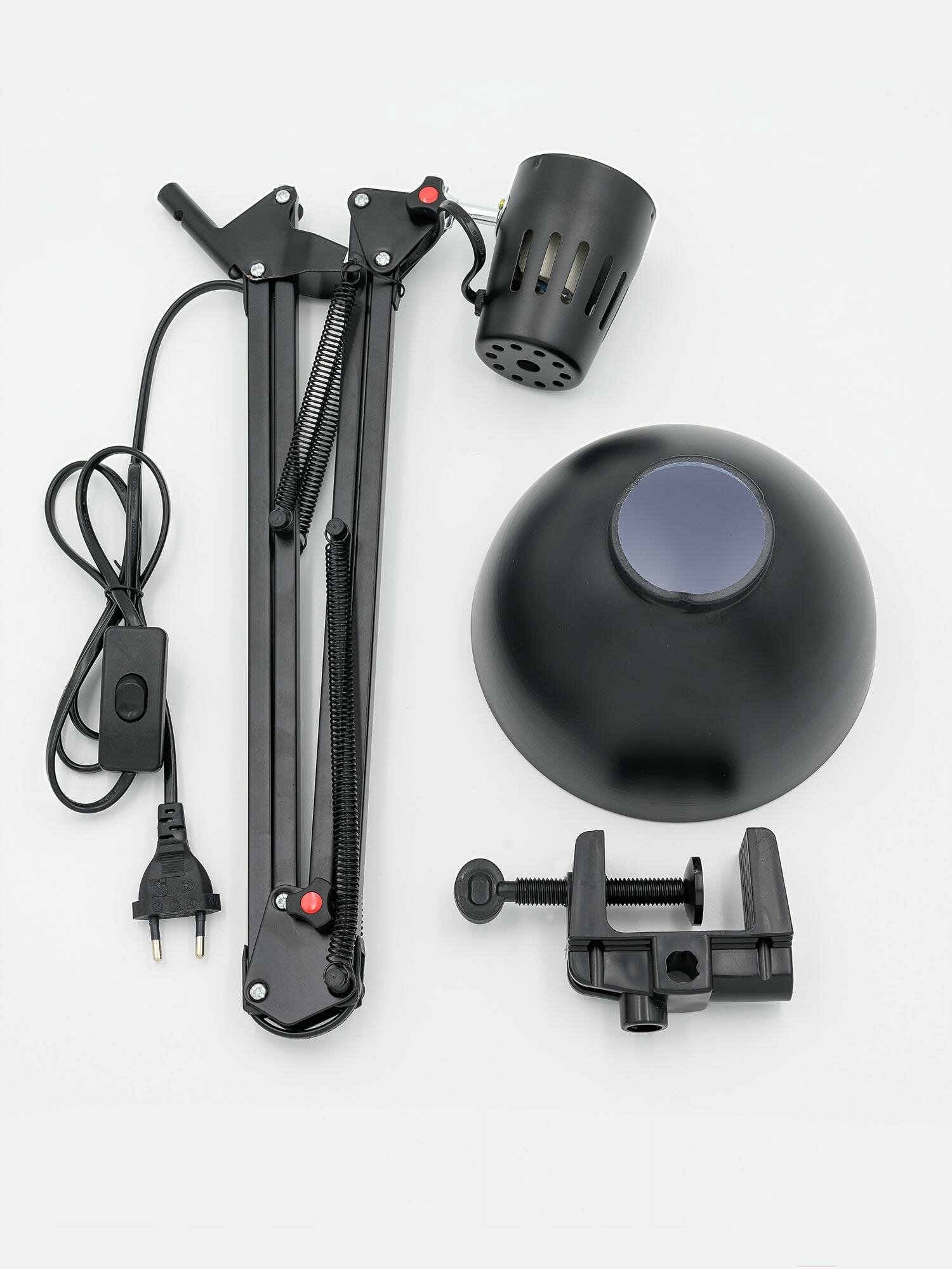 | Минусы: | Пластиковая струбцина не держит вес лампы, можно установить только вертикально |