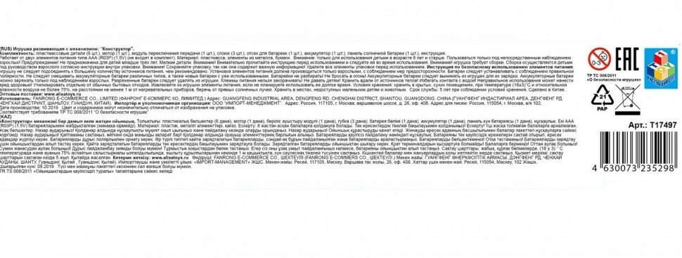 | Комплектация | пластиковые детали для сборки моделей, мотор, модуль переключения передачи, спонж, отсек для батареек, аккумулятор, панель солнечной батареи, инструкция |