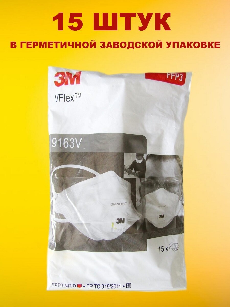 Респиратор 3M 9163V для защиты вирусов, биологических жидкостей, аэрозолей, мелкодисперсной пыли FFP3, 15 шт.