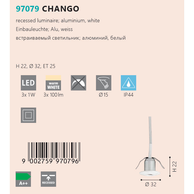 97079 Комплект светодиод. встраиваемых светильников СHANGO, 3х1W(LED), 3х100lm, Ø32, H22, ET25, IP44