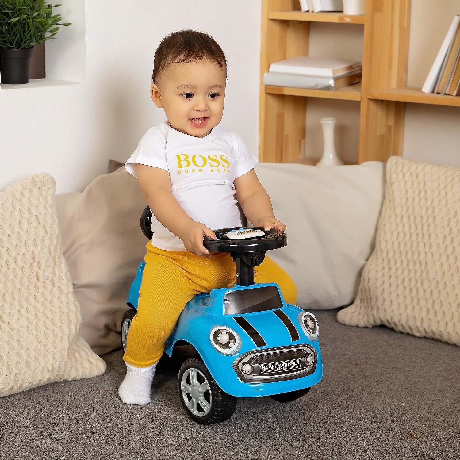 | Дополнительная информация | поворотный музыкальный руль; высота сиденья от уровня пола: 19 см; размер колёс: 13 см |