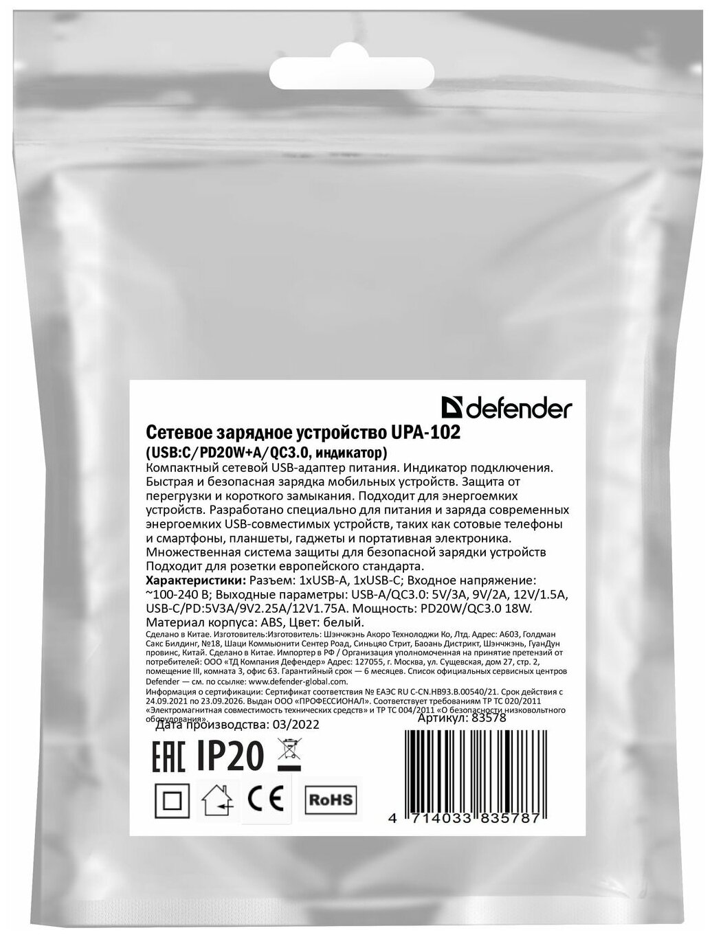 Зарядное устройство сетевое Defender UPA-102 USB:C/PD20W+A/QC3.0, индикатор интересное: