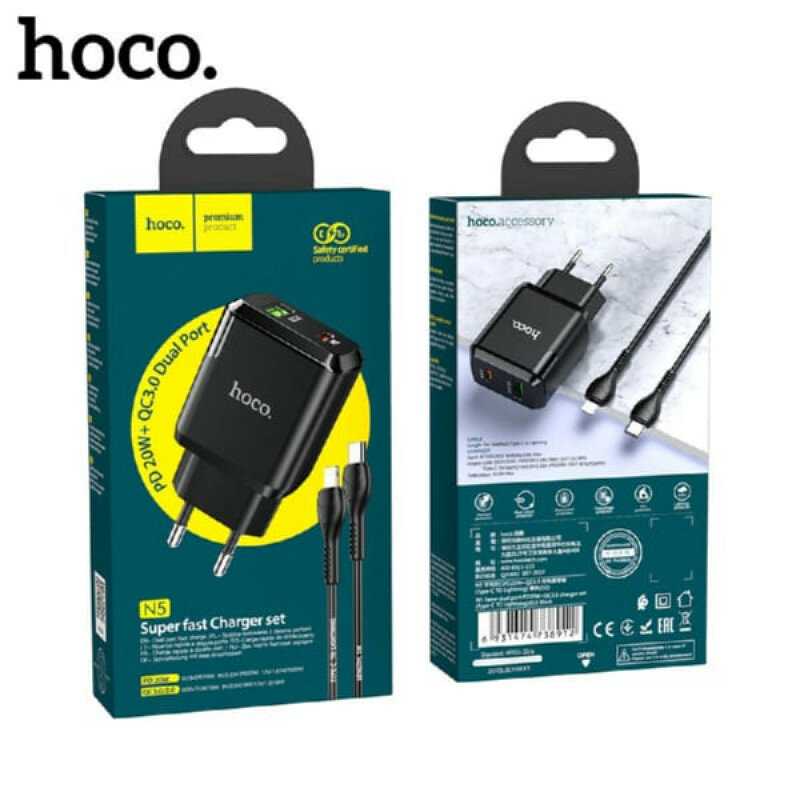Сетевое зарядное устройство, 1 USB 3.0 QC+1 PD 20W (N5), HOCO, Type-C to Lightning, умная зарядка, черный