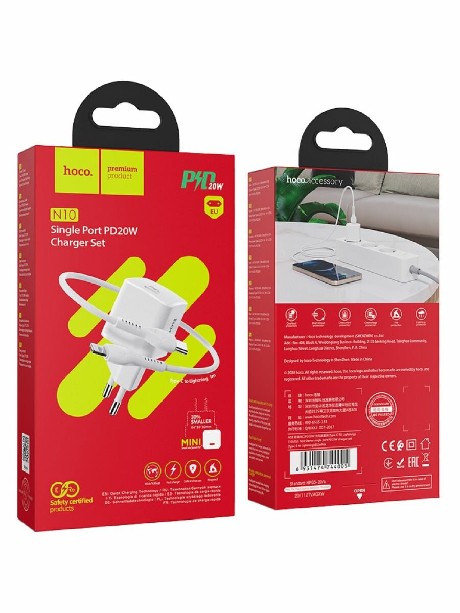 Сетевое зарядное устройство Hoco N10 Starter single port PD20W charger set (+ кабель Type-C to Lightning), белое