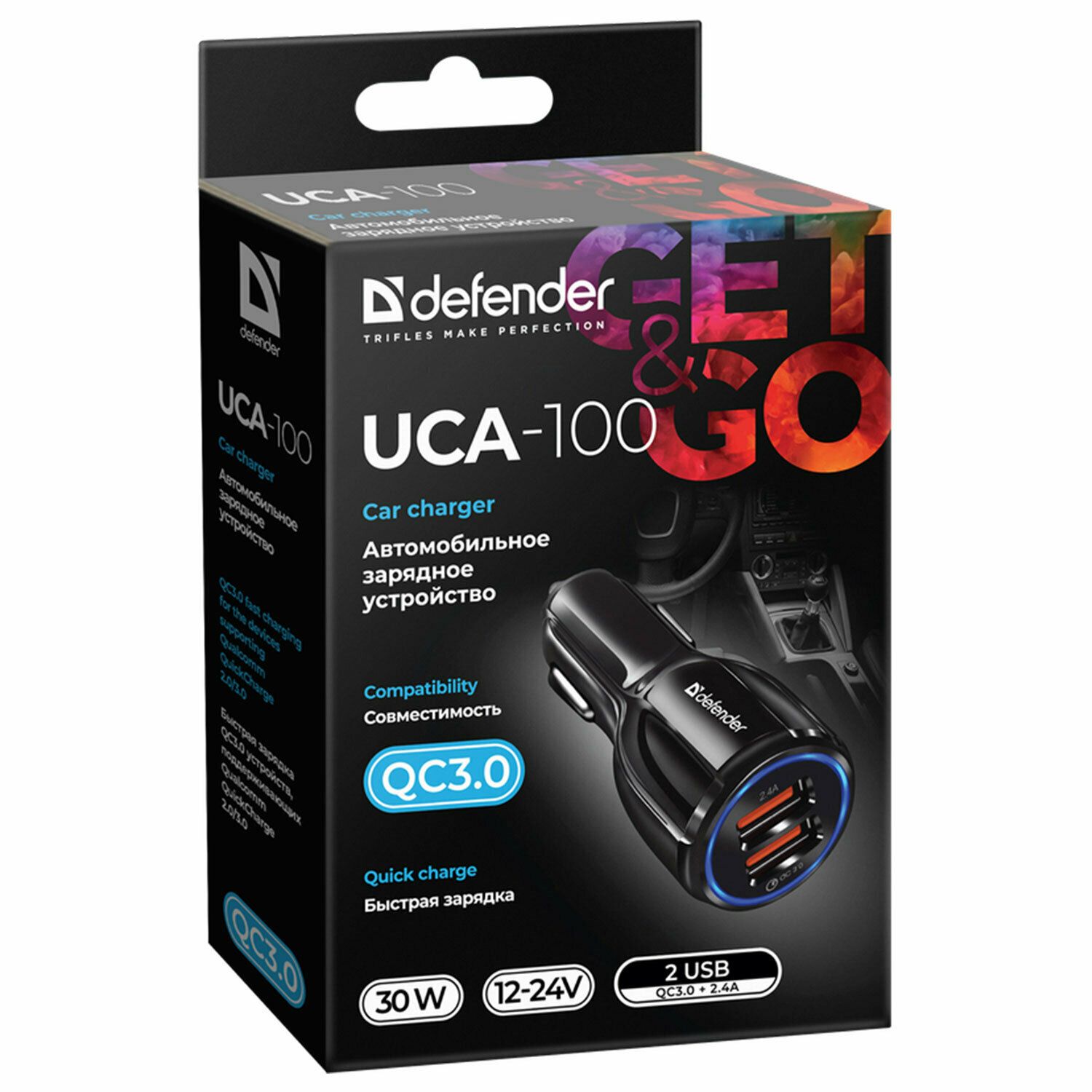 Зарядное устройство Defender Зарядное устройство автомобильное Defender UCA-100 83833, 1xUSB 2.4A, 1xUSB QC3.0, (5400 мА) черный (ret)