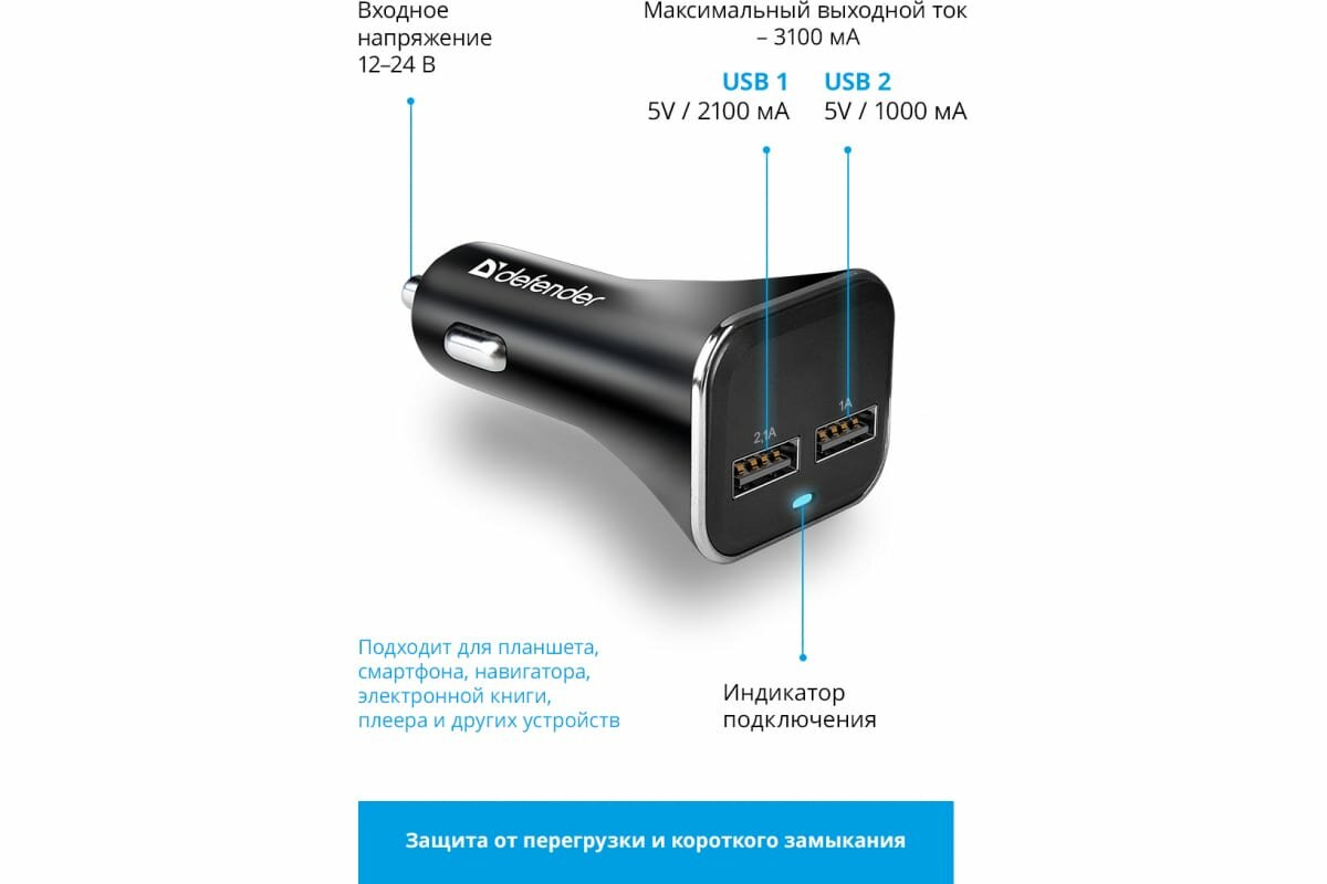 Defender Зарядное устройство автомобильное Defender UCA-31 83597, 1xUSB 2.1А, 1xUSB 1.0А, (3100 мА) (ret)