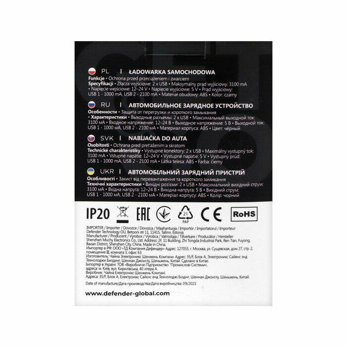 Defender Автомобильное зарядное устройство Defender UCA-31, 2 USB, 3.1 А, индикатор, черное интересное: