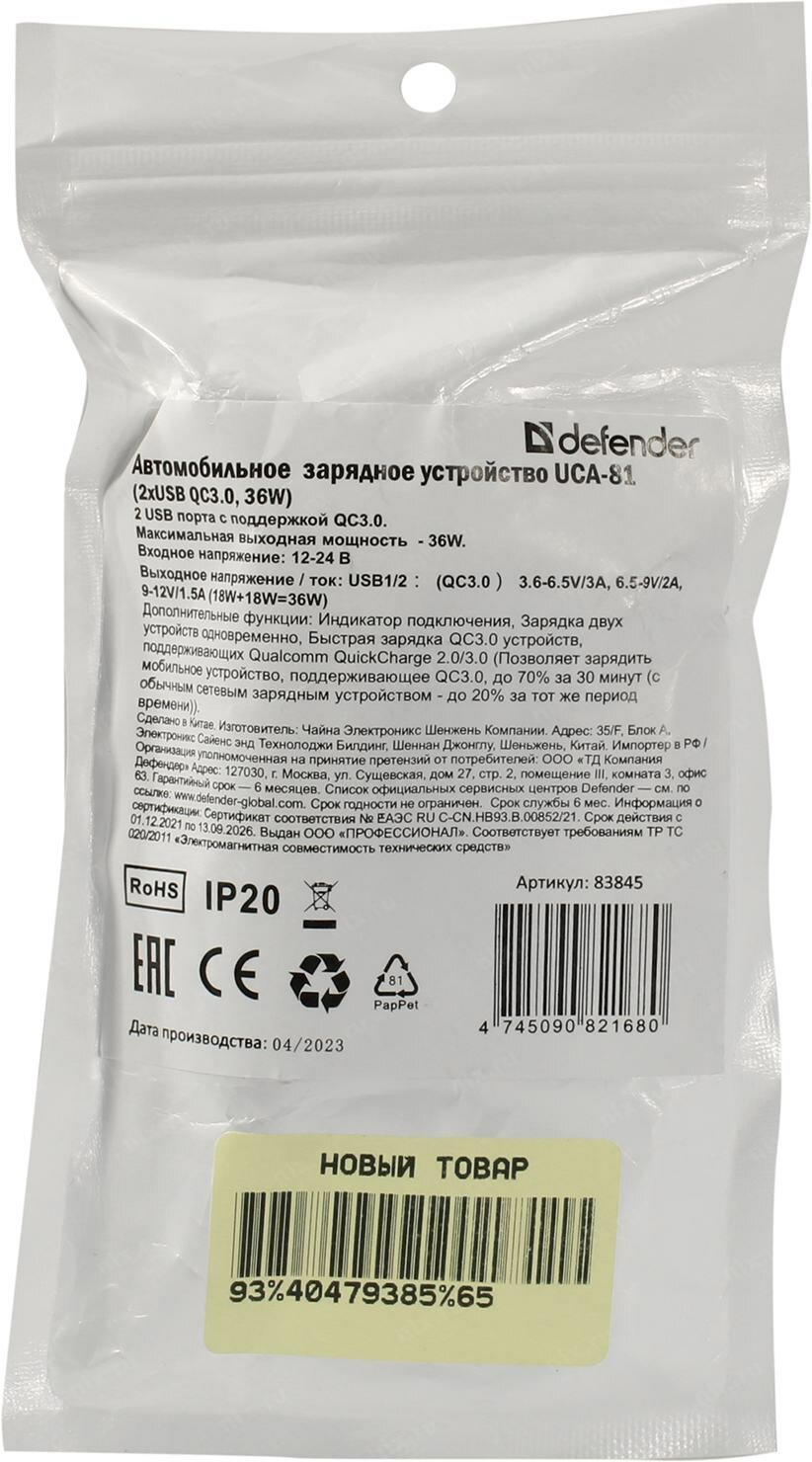 Defender 83845, Defender Автомобильное ЗУ UCA-81 2xUSB QC3.0, 36W