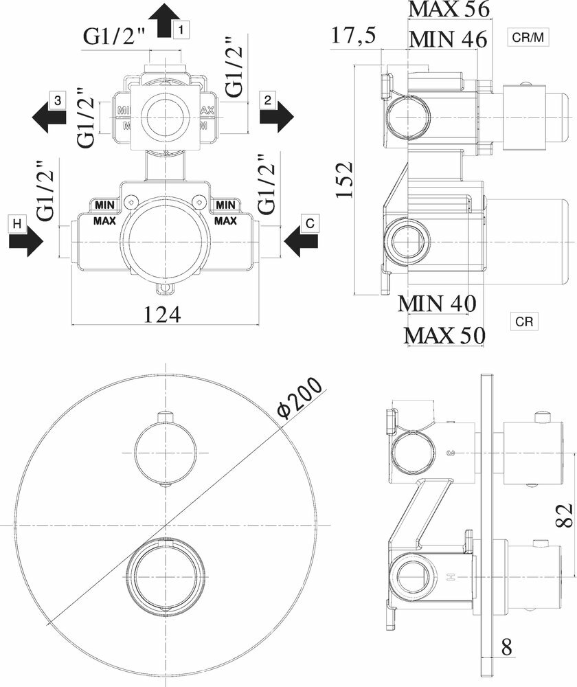 Смеситель Paffoni, серии LIGHT, термостат встраиваемый для душа 3 выход с накл.металл диам.200мм, девиатор-картридж, 3 положения+3 комбо со стоп, Хром LIQ019CR