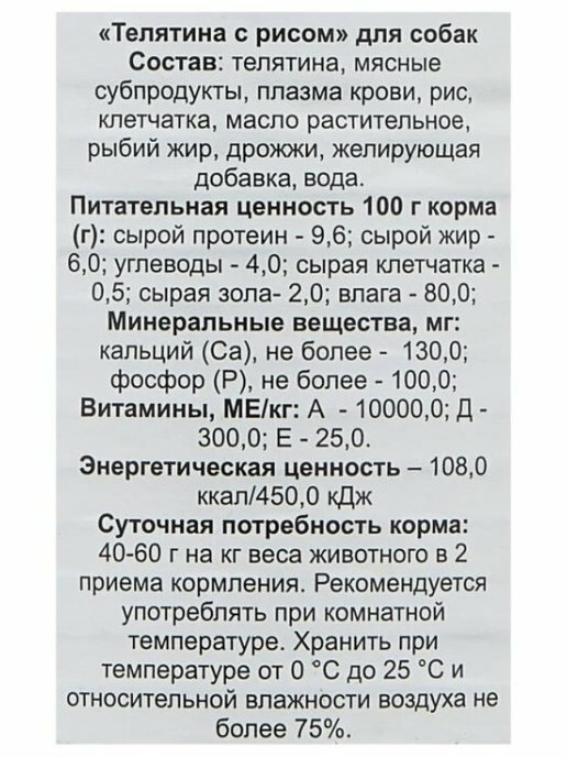 | Состав | телятина, мясные субпродукты, плазма крови, рис, клетчатка, масло растительное, рыбий жир, дрожжи, желирующая добавка |