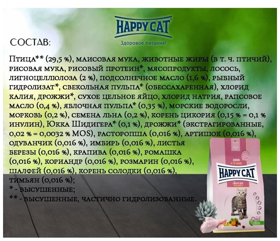 Ниже Вы можете прочитать отзывы на Сухой корм для кошек Happy Cat Хэппи Кэт Юниор Домашняя птица 1,3 кг, ознакомится с подробными характеристиками, посмотреть интересные обзоры и фотографии на Сухой корм для кошек Happy Cat Хэппи Кэт Юниор Домашняя птица 1,3 кг.