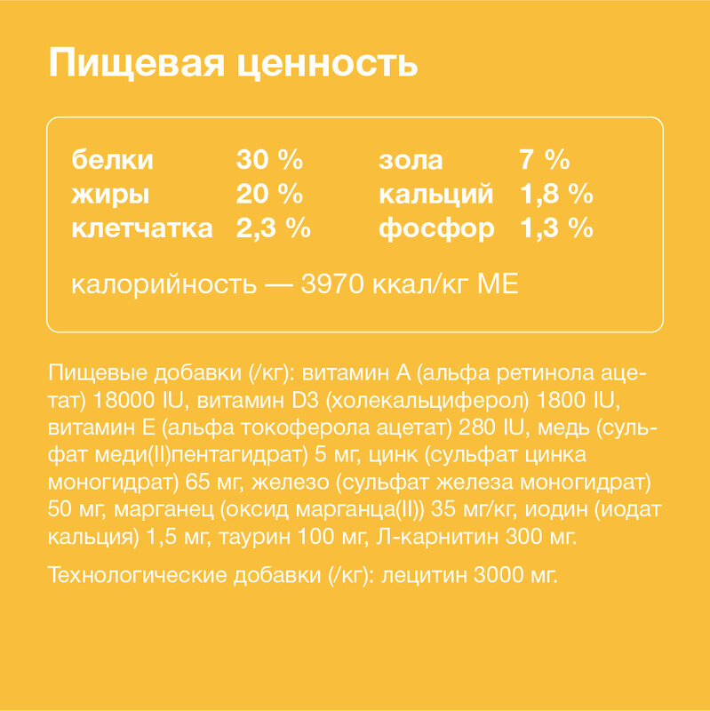 | Энергетическая ценность | 3970 ккал/кг |