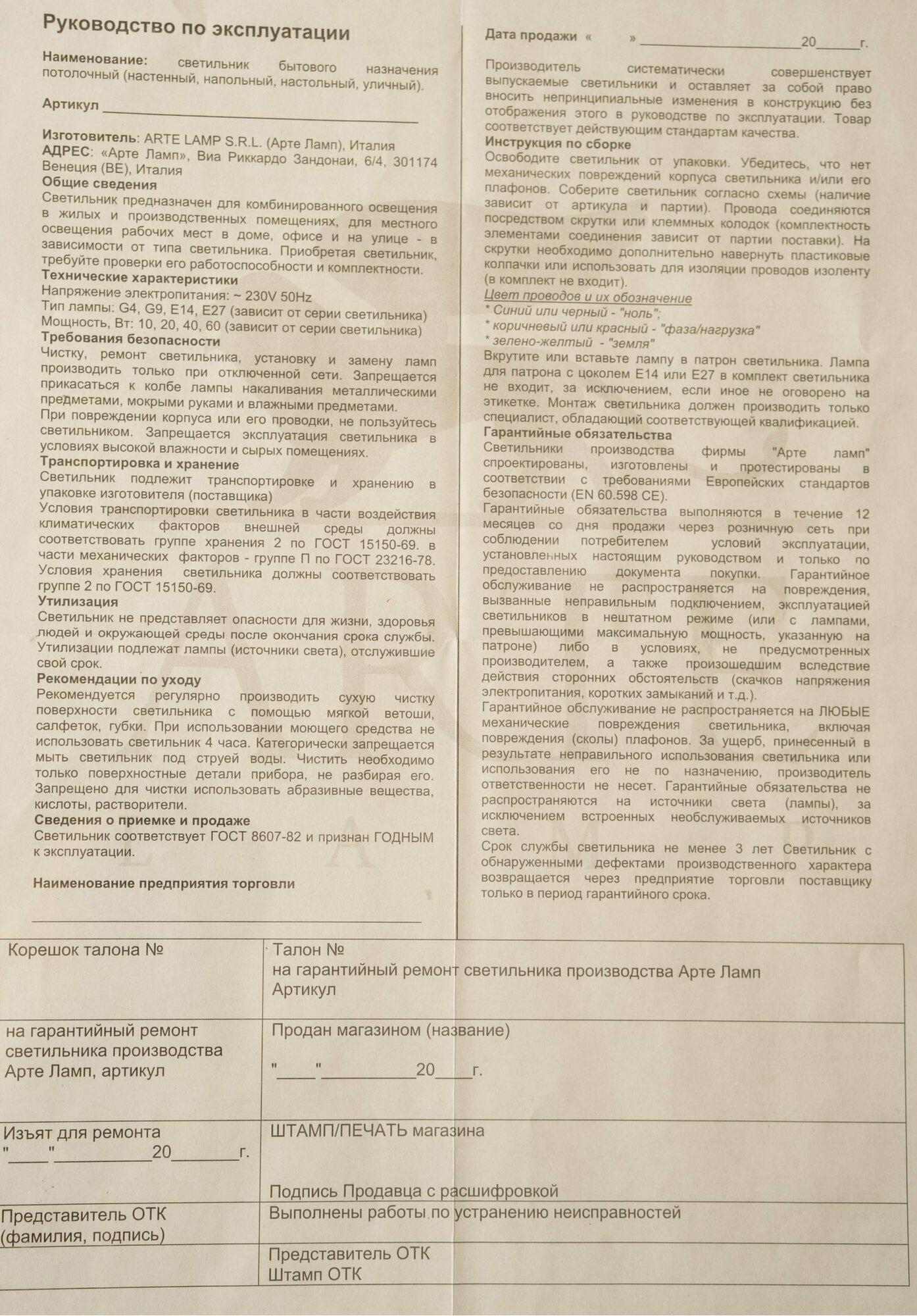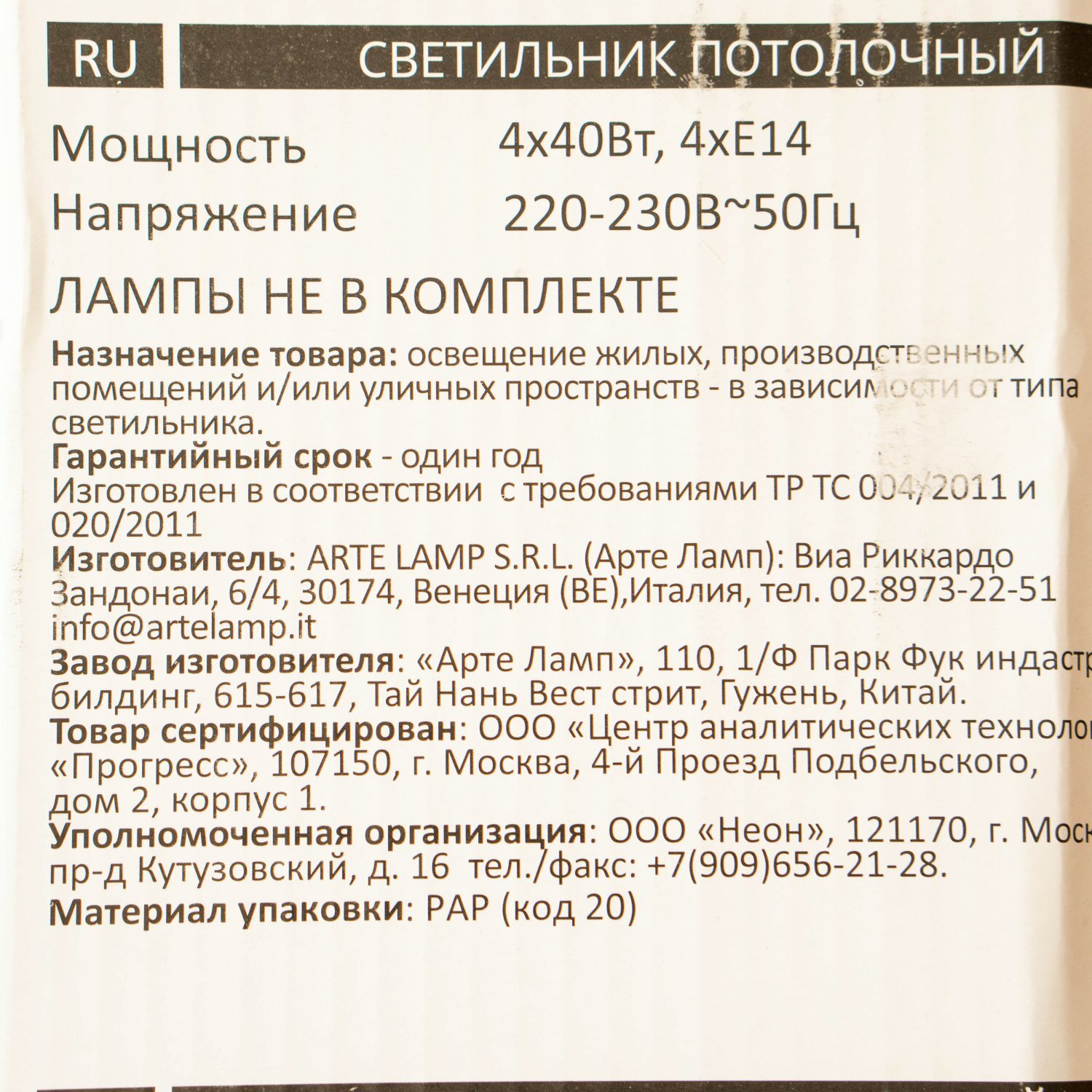 | Параметры плафонов и арматуры | |