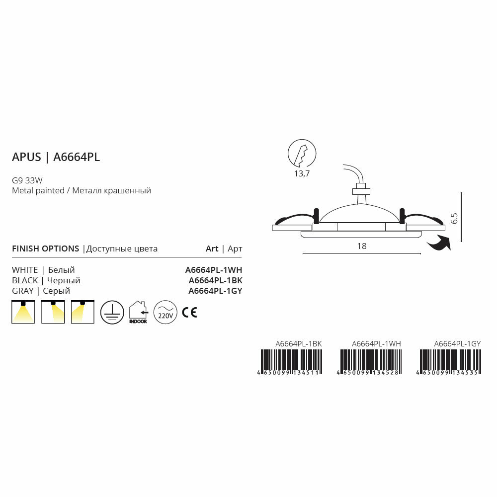 Светильник ARTE LAMP A6664PL-1BK, 33Вт, патрон G9 х 1шт, встраиваемый, на потолок / на стену, черный