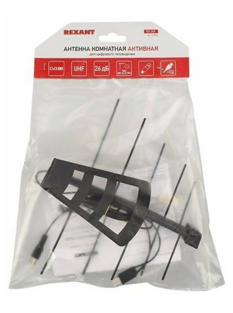 Антенна REXANT RX-269, комнатная, активная, 26 дБи, 5 В, USB, DVB-T2, кабель 2 м, цифровая