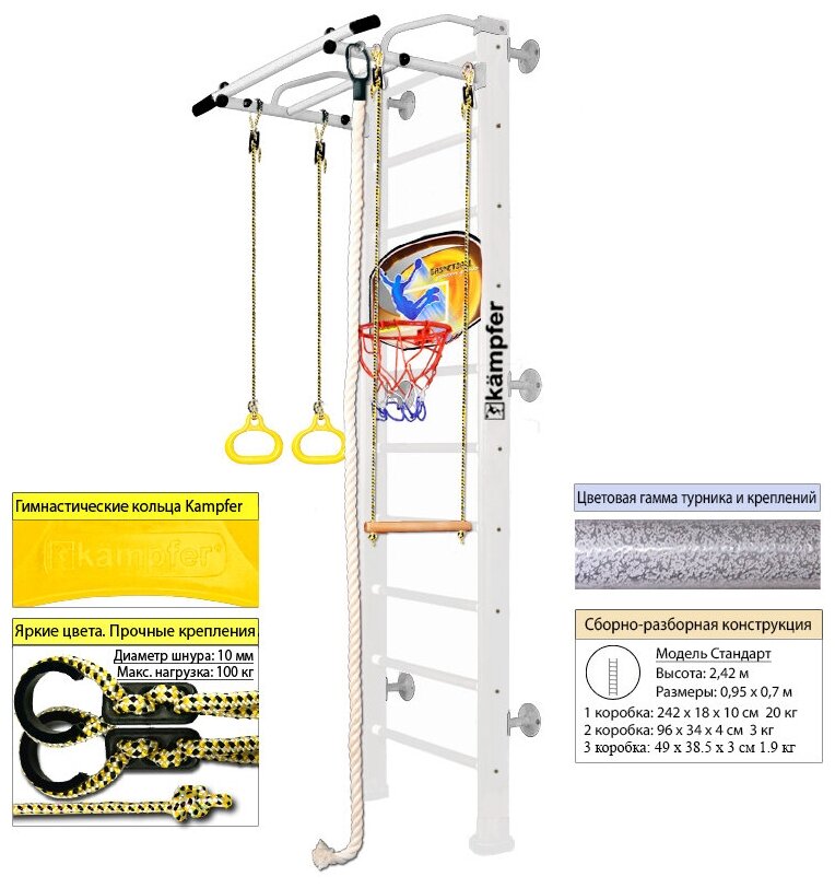 | Подробная комплектация | шведская стенка, турник, канат, гимнастические кольца, трапеция, баскетбольное кольцо |