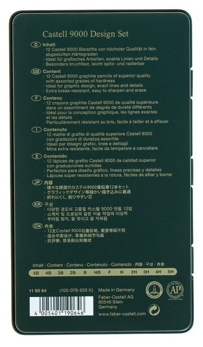 Набор карандашей чернографитных разной твердости Faber-Castel CASTELL 9000, 12 штук, 5H-5B, металлический пенал