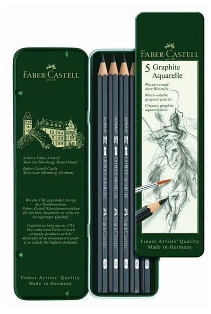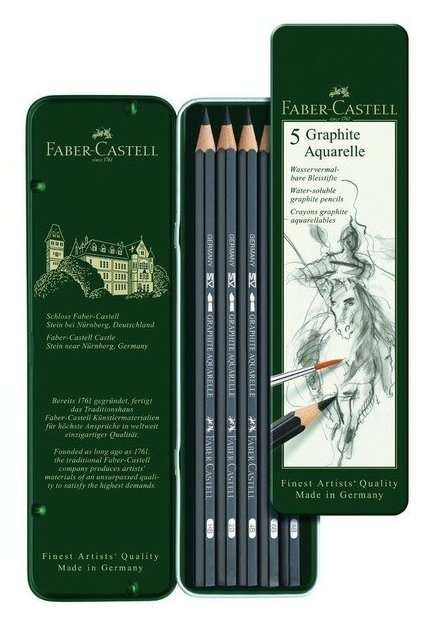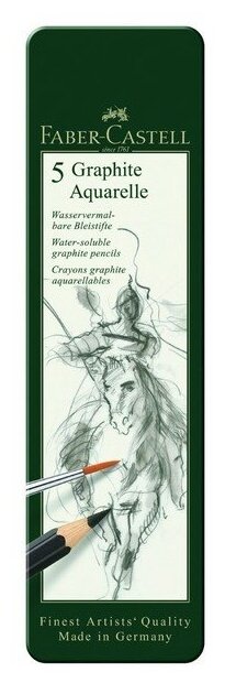 Карандаши графитные 5штук водоразмываемые, HB-8B, "Graphite Aquarelle, в металлическом пенале, артикул 117805 117805 Набор карандашей ч/г акварельных Faber-Castell "Graphite Aquarelle", 5шт., HB-8B, заточ., метал.кор
