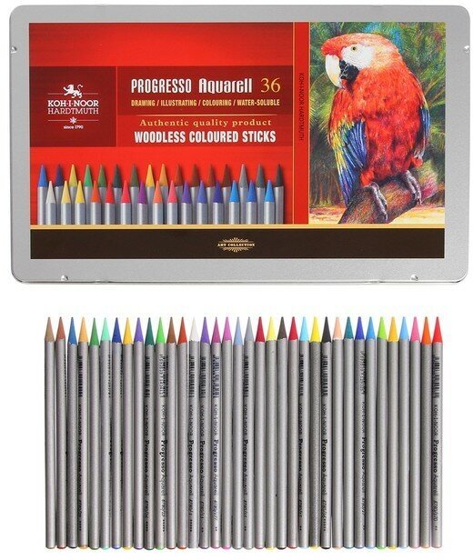 Koh-I-Noor Карандаши акварельные набор 36 цветов, цельнографитовые Koh-I-Noor Progresso Aquarell, в металлическом пенале интересное: