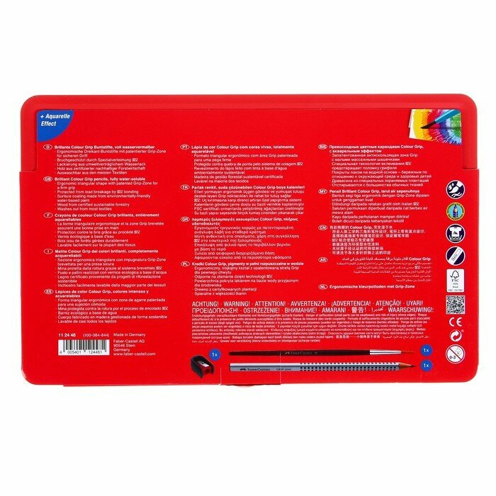 Карандаши цветные Faber-Castell "Grip", 48цв., трехгран., заточ.+ч/г кар. Grip+точилка+кисть, метал. коробка
