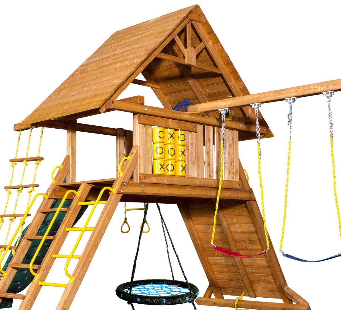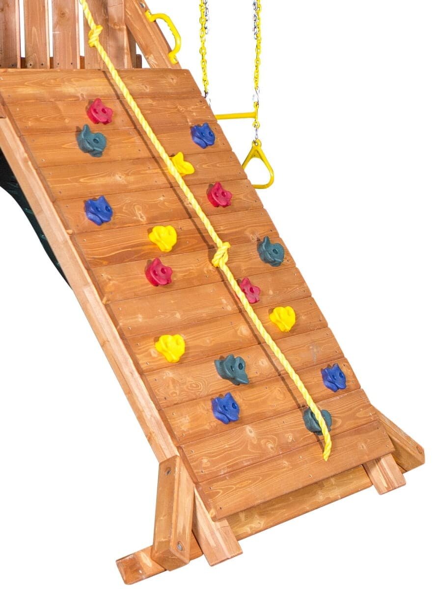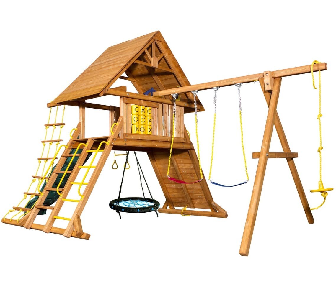 | Комплектация | -игровой домик Castle c деревянной крышей, высота игровой платформы 1,5 метра, размеры платформы 1,22x1,83 метра; -качельная балка с "А" опорой 3-х позиционная: с 2-мя резино-пластиковыми мягкими качелями на металлических цепях, покрытых пластиком, и качелями "диск" на канате; -двухволновая пластиковая горка длиной 2,8 метра; -качели "колесо" на цепях облитых пластиком с поворотом на 360 градусов; -веревочная лестница с деревянными ступеньками; -комбинированная деревянная лестница:ступеньки/перекладины с поручнями безопасности; -скалодром с 16-ю цветными «камнями» и канатом длиной 4 метра; -игровая панель «Крестики-нолики»; -штурвал; -отдельный брус с акробатическими качелями "трапеция" с ручками. |