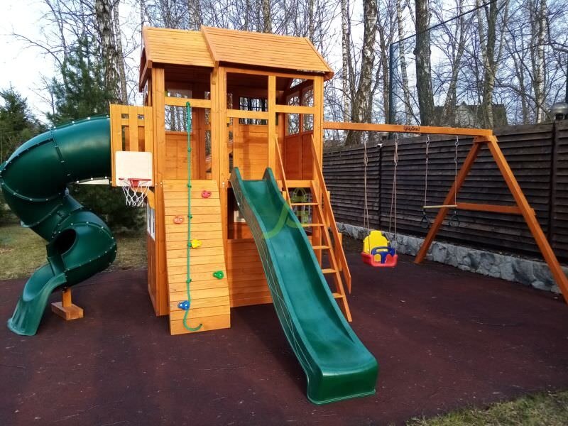 | Комплектация | - закрытый двухуровневый игровой домик с дверью, деревянной крышей; - балкон; -увеличенный первый этаж с доп. домиком; - отдельно стоящий дополнительный двухуровневый домик с деревянной крышей; - деревянное кашпо; - пластиковое окошко; - волновая горка S-line 3 м; - горка труба с высотой 1,5 м; - рукоход; - подвесной мостик; - деревянная лестница; - скалодром; - канат; - качельный модуль; - качели-гнездо 100 см; - доска для игры в “Крестики-нолики”; - комплект фурнитуры; - руководство по сборке. |