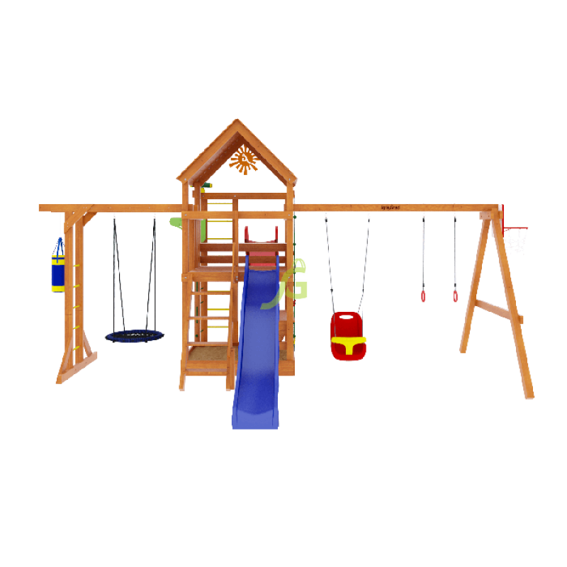 | В комплекте | баскетбольное кольцо, гимнастические кольца, боксерская груша, качели, канат, лестница, рукоход, сетка для лазания, песочница, турник |