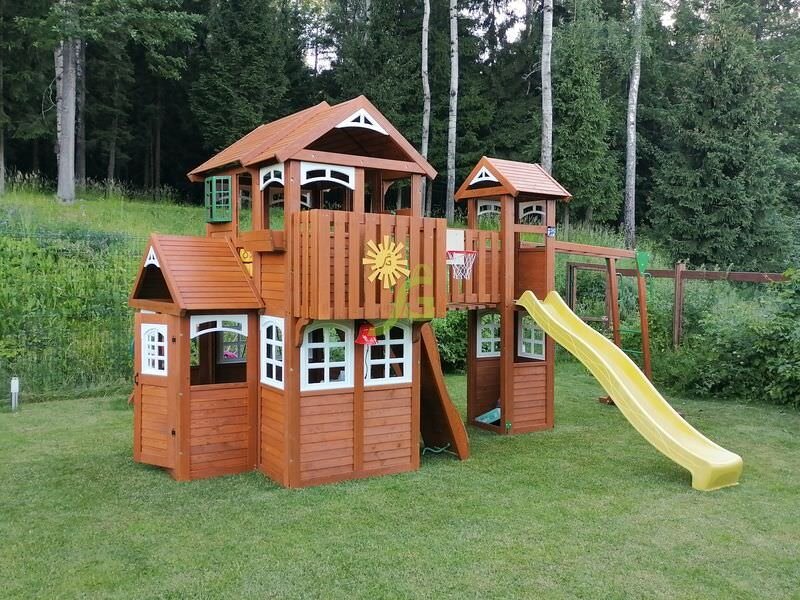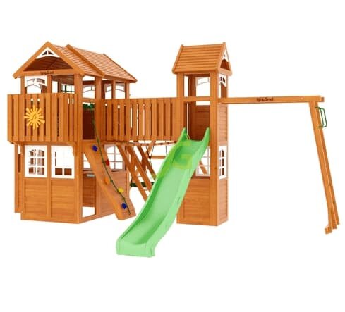 | Комплектация | - закрытый двухуровневый игровой домик с дверью и деревянной крышей; - увеличенный первый этаж с доп. двускатной крышей; - дополнительный двухуровневый домик с деревянной крышей; - балкон; - деревянное кашпо; - волновая горка S-line 3 м; - рукоход; - подвесной мост; - деревянная лестница; - скалодром; - канат; - качельный модуль; - качели-гнездо 100 см; - доска для игры в “Крестики-нолики”; - пластиковое окошко; - комплект фурнитуры; - руководство по сборке. |