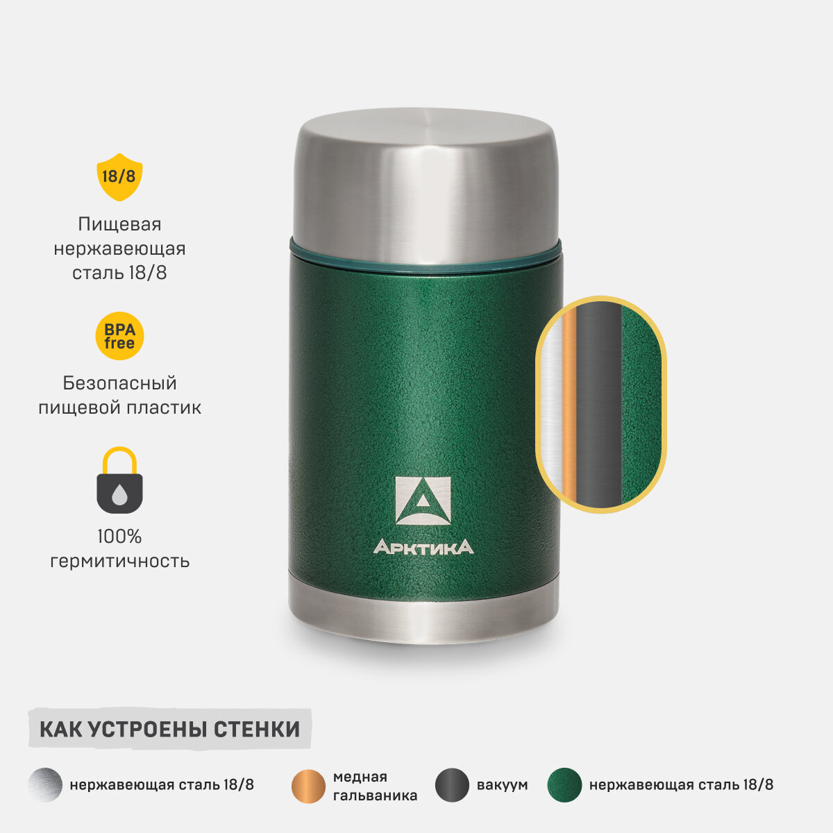 Термос для еды Арктика (0,6 литра) с супер-широким горлом, зеленый