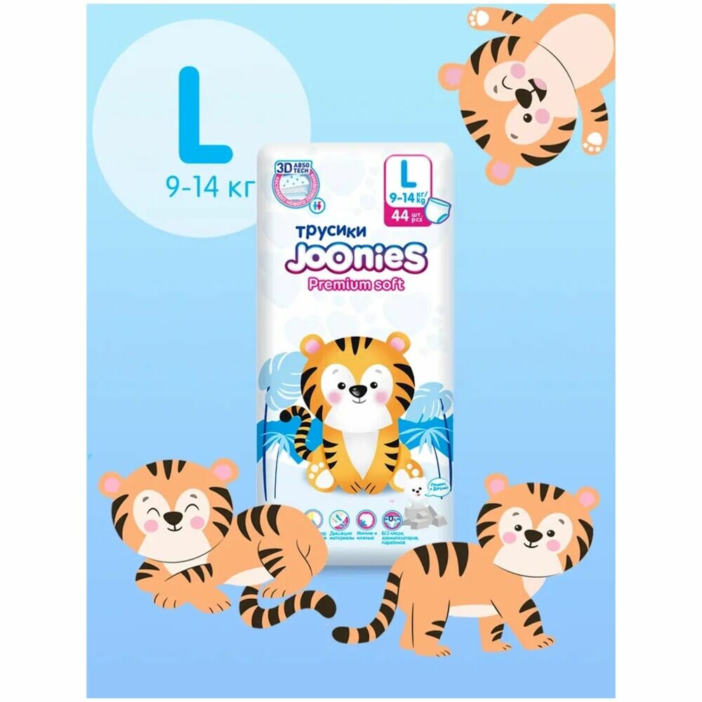 Подгузники-трусики JOONIES Premium Soft, размер L (9-14 кг), 44 шт.