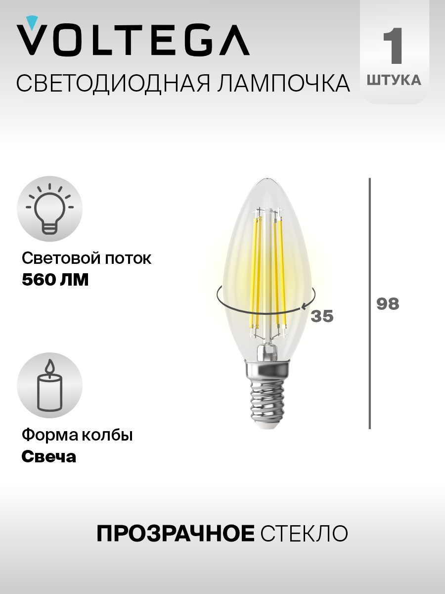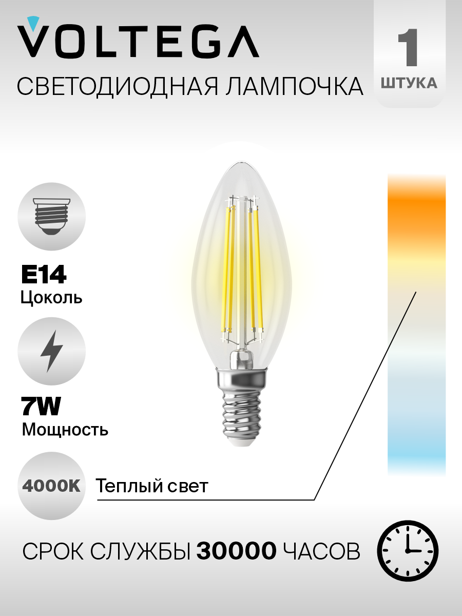 Лампа светодиодная филаментная Voltega E14 4000К 7 Вт 560 Лм 220-240 В свеча прозрачная