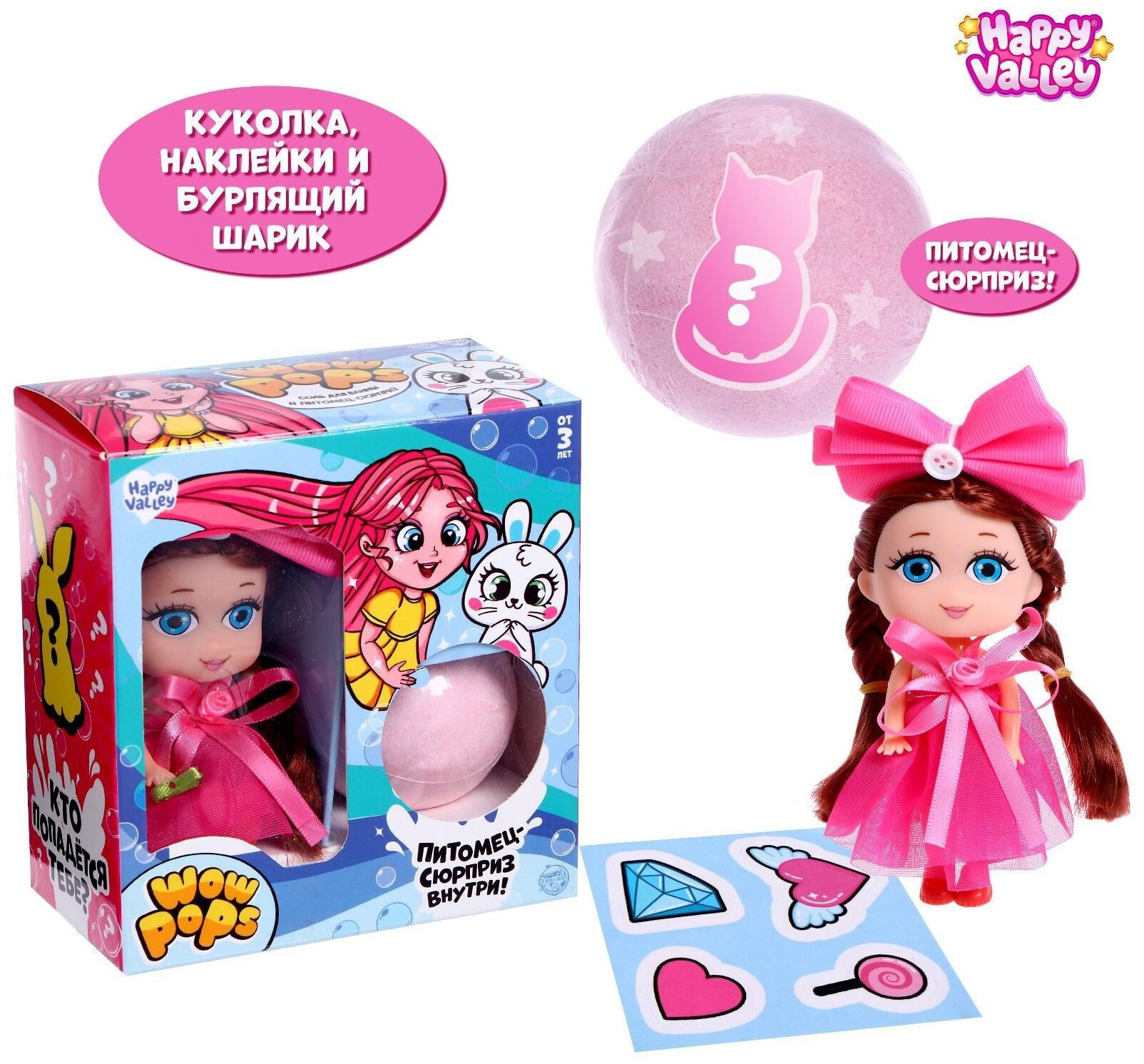 | Комплектация | кукла, наклейки, бомбочка для ванны, питомец-сюрприз |