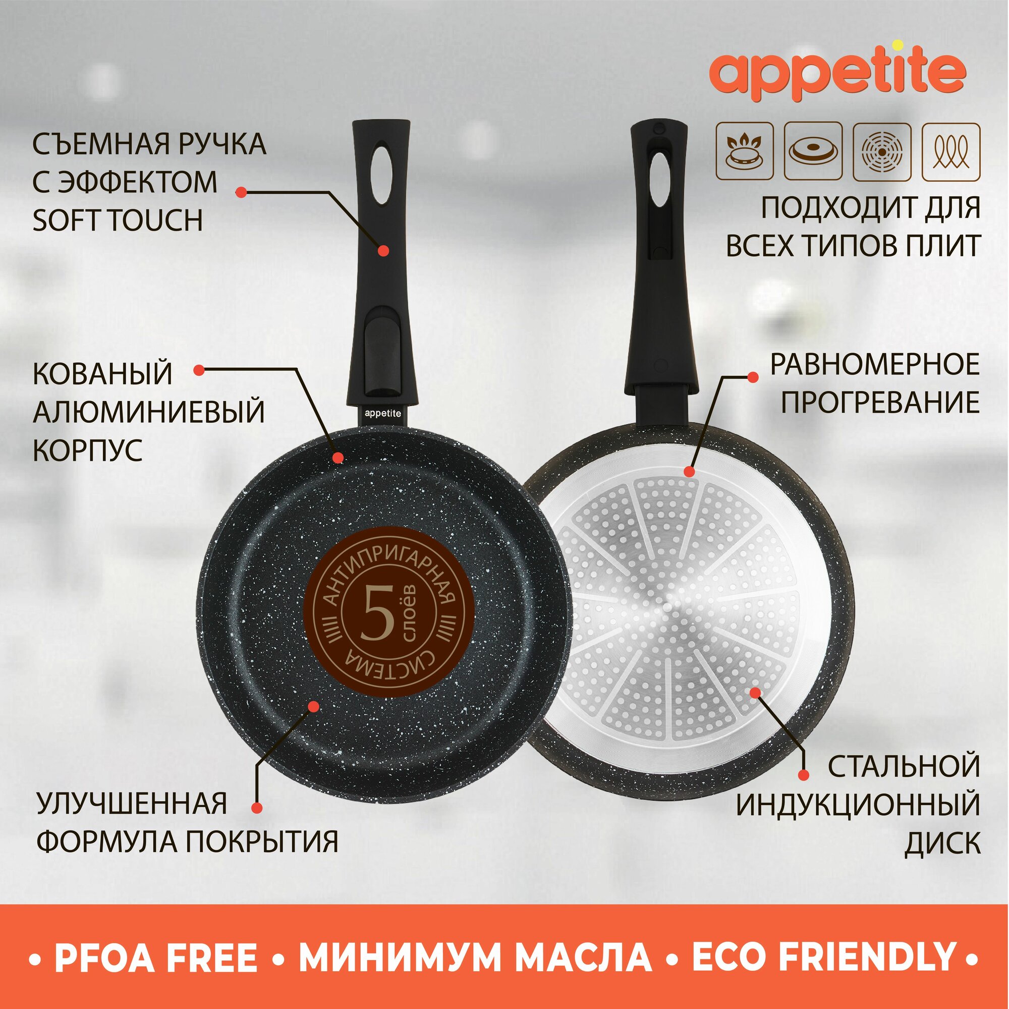 Сковорода Appetite Black Stone 24 см со съемной ручкой