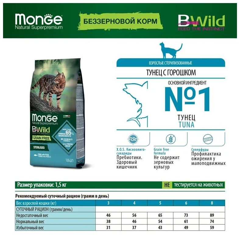 Корм Monge Cat BWild GRAIN FREE беззерновой корм из тунца для стерилизованных кошек 1,5 кг интересное:
