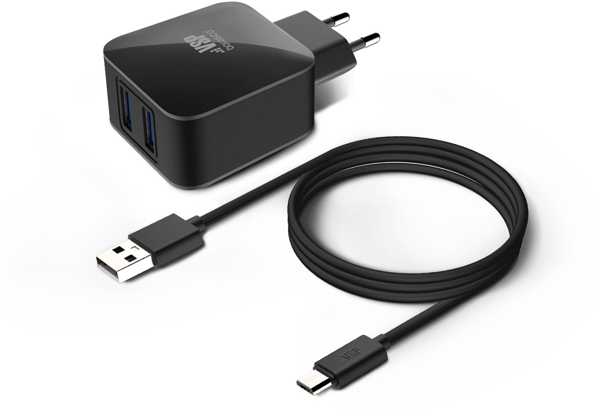 Сетевое зарядное устройство Borasco 2хUSB-А, кабель micro USB, 2 А, 1 м, черный