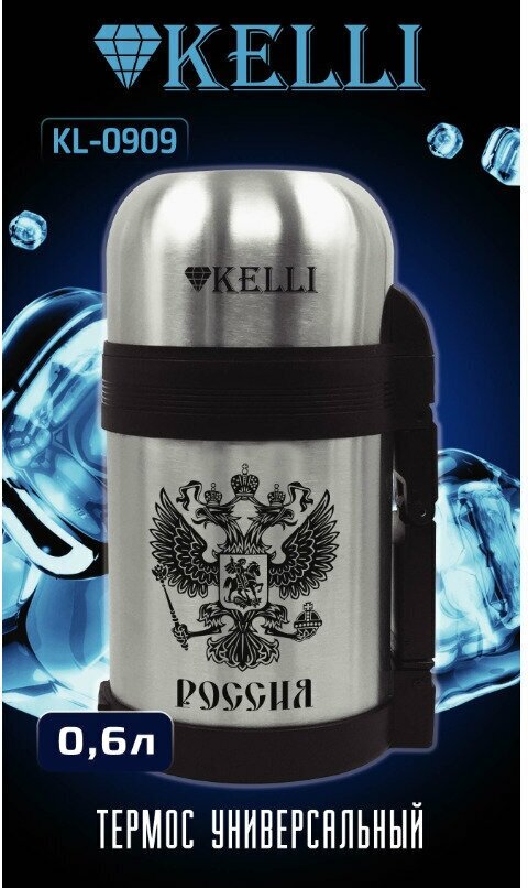 Термос Kelli 0,6 с ручкой и ремешком для переноски, KL0909, серебристый, нержавеющая сталь