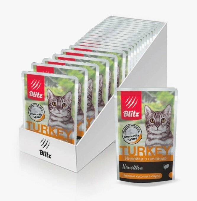 Blitz Sensitive Turkey влажный корм для кошек паучи Индейка с печенью в соусе 85г х 24шт